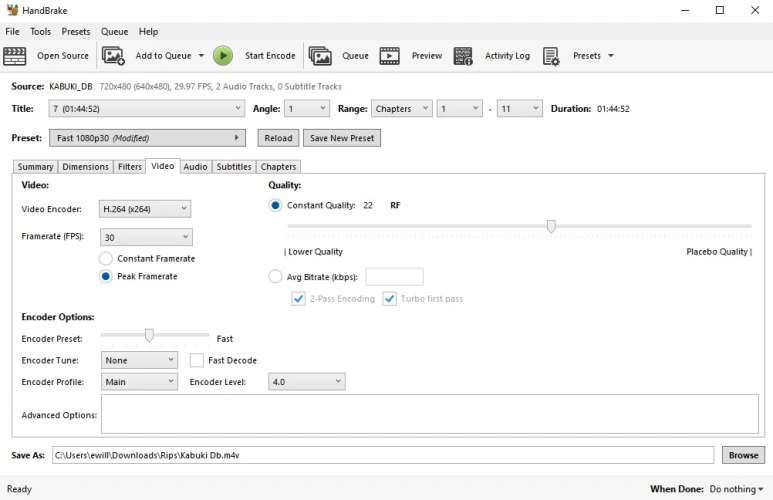 确保另存为字段将视频放在您想要放到硬盘上的位置(请参见上面的准备库),然后将文件名更改为您想要的任何名称。然后点击开始编码,如果你只是翻录一部电影。如果要从一张光盘翻录多部电影或一部剧的多集,请选择每个标题,然后单击添加到队列。这将加载所有视频,并在您单击开始队列时一次性翻录所有视频。