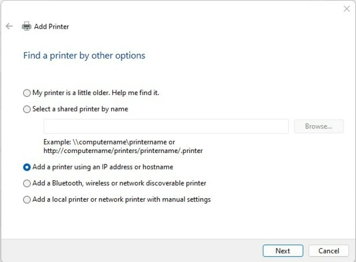 搜索打印机后,单击未列出我想要的打印机以打开一个对话框,通过该对话框可以通过其他方式找到打印机。这里有五个选项: