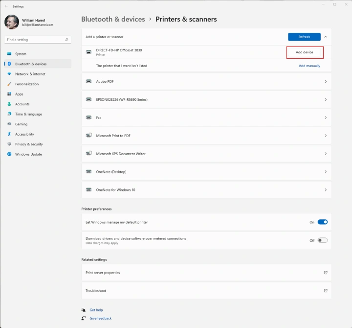 但如果您的设备未列出,您可以手动添加。在Windows 10中单击添加打印机或扫描仪按钮,或在Windows 11中单击添加设备按钮。Windows开始在您的网络中搜索连接的打印机,并列出搜索结果。只需单击要连接的打印机,然后单击添加设备。