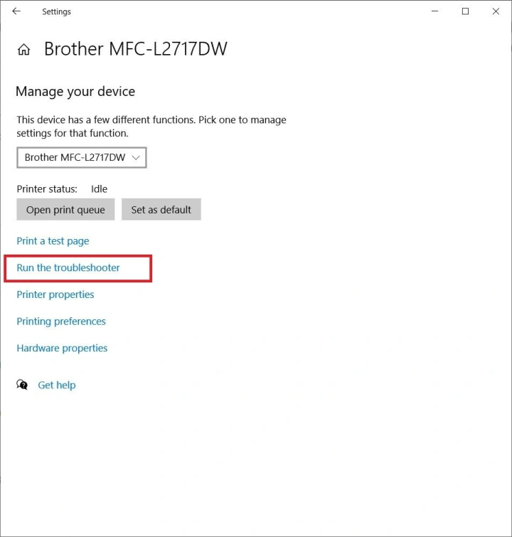 在此过程中的任何时候,您都可以运行Windows疑难解答以尝试连接到打印机。要运行故障诊断程序,您在连接或打印时遇到问题的打印机必须显示在打印机和扫描仪菜单的可用设备列表中。要运行它,请在列表中单击该打印机,然后单击管理。