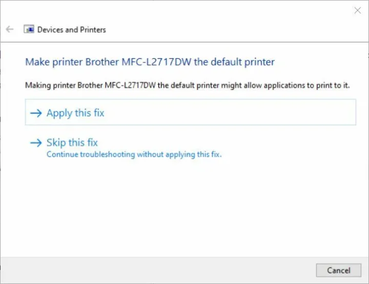 如果Windows检测到问题,它会显示另一个对话框,通知您问题所在,并根据问题的具体情况提供可能的解决方案。例如,Windows可能希望您将有问题的打印机设置为计算机的默认打印机。