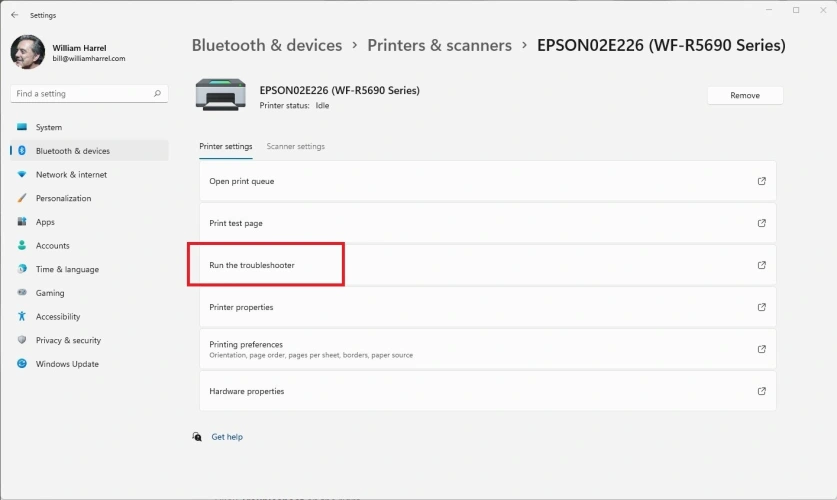 在Windows 11中,这将调出该特定打印机的控制面板。从选项列表中单击运行疑难解答以使Windows搜索问题。Windows 10用户将看到一个新的对话框,在该对话框中,您可以单击菜单中的运行故障排除程序。