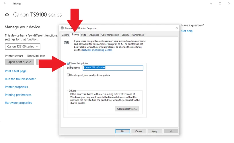 如果要使用的打印机连接到本地网络上的另一台计算机,则必须首先确保启用了打印机共享。按照上述说明打开打印机和扫描仪屏幕,然后选择打印机并单击管理。转到打印机属性,打开共享选项卡,然后启用共享此打印机。(在Windows 11中,您可能首先需要选择更改共享选项,然后才能选中共享此打印机框。)