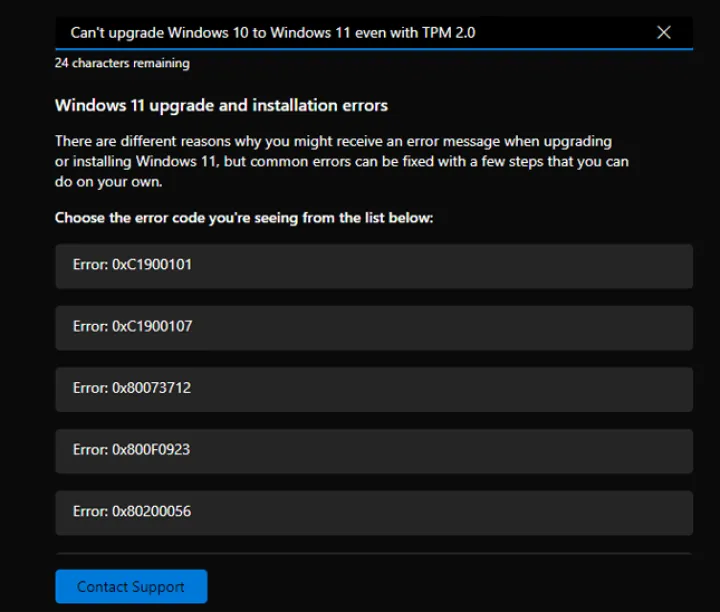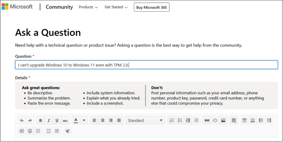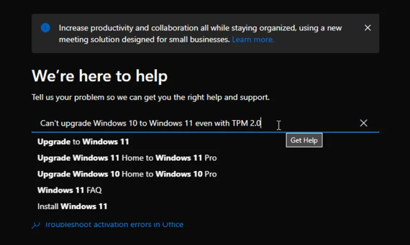 弹出Get Help窗口,虚拟代理将尝试解决您的问题。键入对您遇到的问题的描述,然后按Enter键提交消息。(对于这篇报道,我们说过,即使是TPM 2.0,我们也无法从Windows 10升级到Windows 11。)