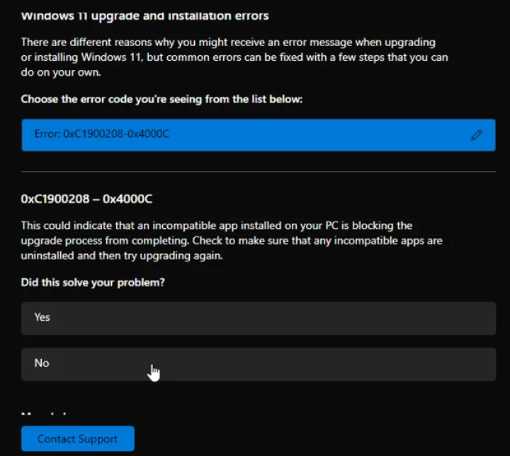 根据您的问题,下一个屏幕可能会建议与该问题相关的各种主题、产品或类别。单击与您的问题最匹配的建议。在我们的示例中,应用程序要求我们选择在尝试升级时看到的正确错误代码。