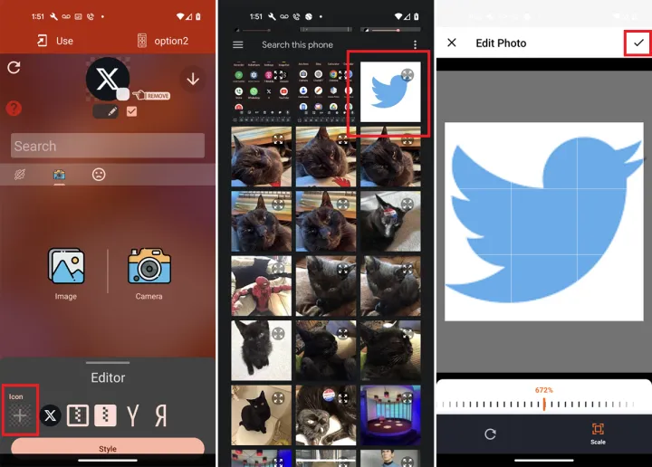 接下来,点击图标部分下的加号(+)图标并选择图像。从图片库中,点击您下载的Twitter徽标图像。在预览屏幕上,向右或向左移动滑块以调整图像的大小和比例。完成后,点击右上角的复选标记。