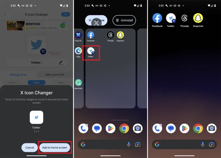 回到主屏幕,确认图标的名称和徽标。点击顶部的OK,然后选择Add to Home Screen。然后,你可以从主屏幕上移除旧的X图标,并使用新的Twitter图标。