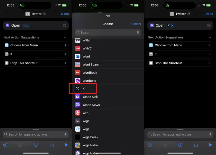 在下一个操作建议部分,点击打开应用程序。在下一个屏幕中,点击单词Open旁边的App变量。向下滚动应用程序列表并选择X。该命令现在应该显示为Open X。这意味着快捷方式将在点击时打开X应用程序。