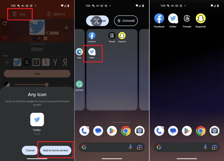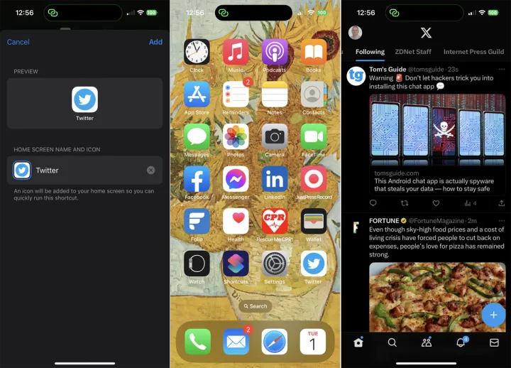 点击选择,然后点击添加。现在你会在你的主屏幕上看到熟悉的Twitter名称和应用程序快捷方式的徽标。你现在可以在主屏幕上隐藏X应用程序了。只要在你想启动X/Twitter的任何时候点击这个图标。