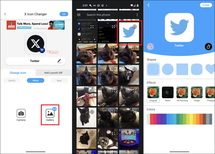 点击中间的照片按钮,然后选择画廊。观看视频广告后,选择您下载的Twitter徽标图像。如果您愿意,可以调整形状或添加效果,然后点击完成。