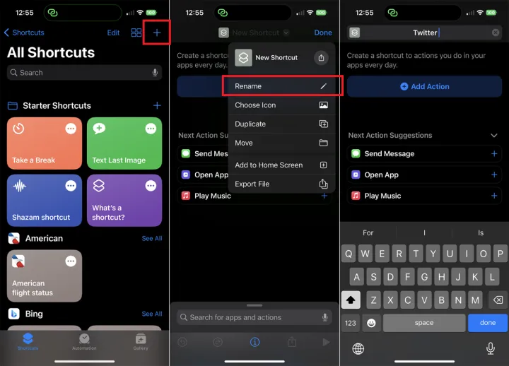 接下来,打开快捷方式应用程序并点击加号(+)图标以创建新的快捷方式。在下一个屏幕的顶部,点击New快捷方式>重命名,然后输入Twitter作为名称。