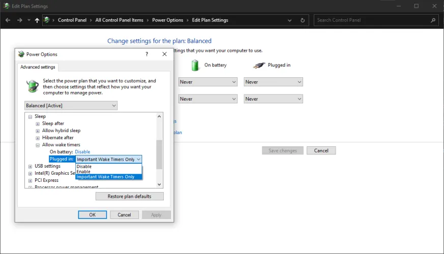 前往睡眠>允许唤醒计时器,并将电池模式和插电模式都更改为禁用。您将希望在顶部的下拉菜单中对所有电源计划重复此过程,而不仅仅是您当前使用的电源计划。