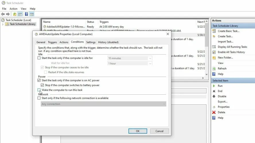 这可能会帮助您查找旨在唤醒您的PC的计划任务。如果你找到任何你想关闭的任务,打开开始菜单,搜索“任务计划程序”,然后使用侧边栏导航到有问题的任务,并双击进行编辑。选择条件选项卡,然后取消选中唤醒计算机以运行此任务框。