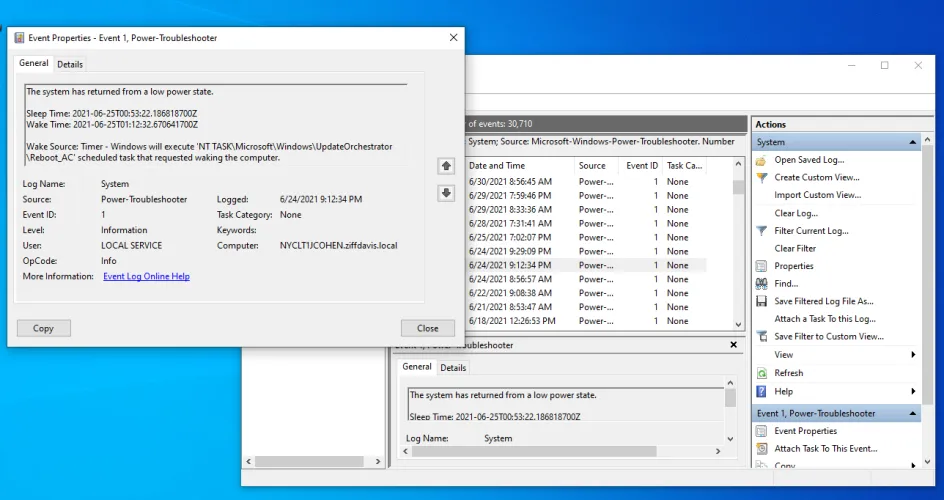 从Event Sources(事件源)下拉菜单中选择Power-Troublrouoter(电源-故障排除程序),然后单击OK(确定)以查看您的计算机最近唤醒的所有时间及其原因。使用Kernel-Power进行过滤可能也有帮助,但根据我的经验,它不太可能包含有用的数据。