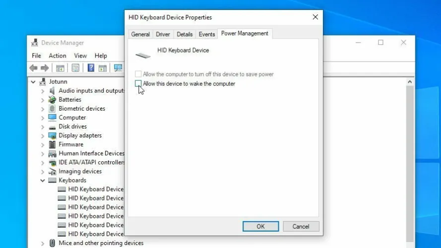 找到有问题的硬件后,打开开始菜单并搜索“设备管理器”。在显示的列表中找到设备–比如你的键盘–然后右击它。选择属性和电源管理选项卡,然后取消选中允许此设备唤醒计算机选项,然后单击确定。