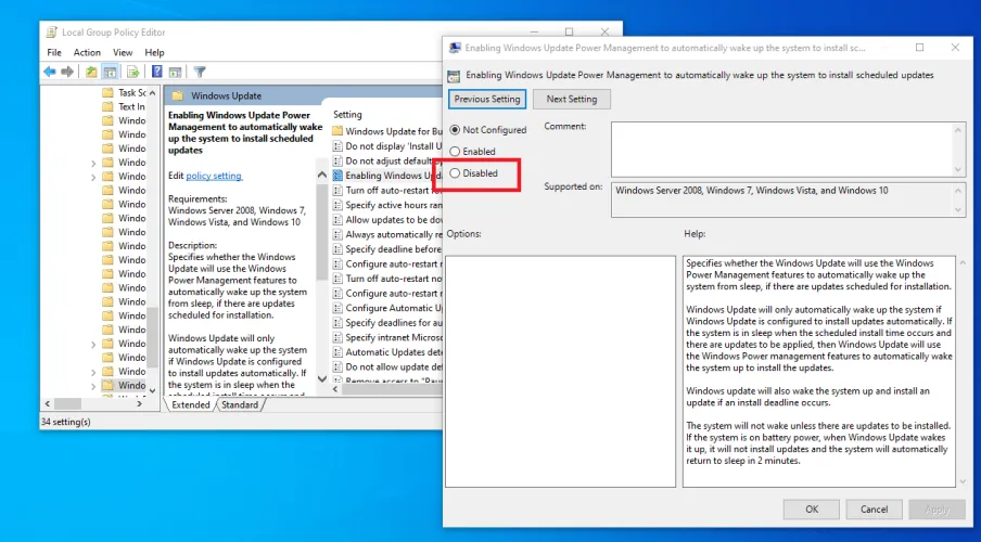 在本地组策略编辑器打开的情况下,进入计算机配置>管理模板>Windows组件>Windows更新,然后双击启用Windows更新电源管理并将其设置为禁用。