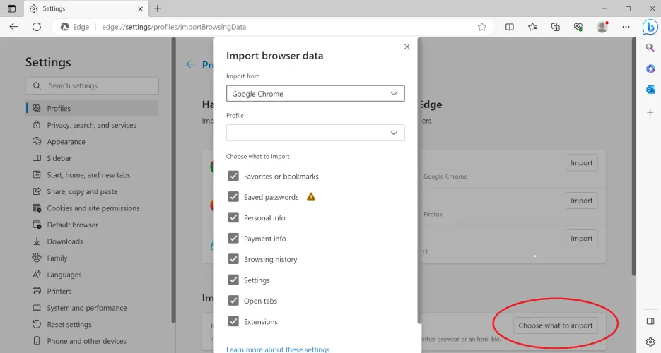 打开Edge,单击右上角的三个点,然后单击设置>配置文件>导入浏览器数据。你可以带上你的收藏夹/书签、保存的密码、个人信息、支付信息、浏览历史记录、设置、打开的标签,以及Chrome、Firefox和Internet Explorer(如果你还在使用它的话)的扩展。