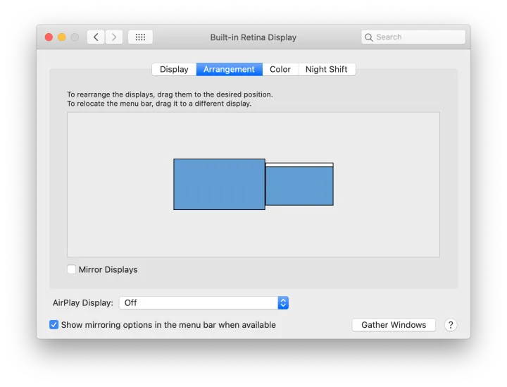 Mac用户在MacOS中也有类似的显示设置菜单。打开系统设置,然后从侧边栏中选择显示选项以查看弹出菜单。单击菜单中的排列选项卡,以最适合您的设置的方式对齐显示器。