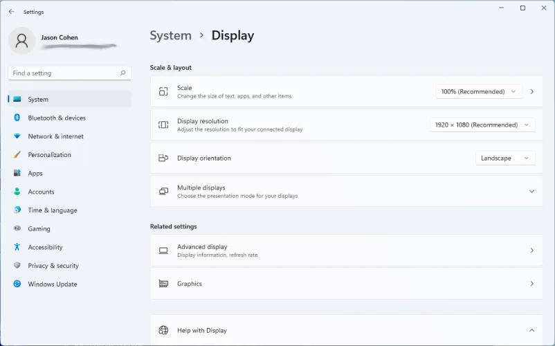 如果您在1080P显示器旁边有一台4K显示器,请打开显示设置,然后向下滚动到屏幕比例和布局部分,以调整每个显示器的分辨率及其比例。因此,如果您有两种不同的分辨率,您可以将每个显示器设置为其原始分辨率,但在较高分辨率的显示器上增加缩放比例,以便您的窗口在每个显示器上显示相同的大小。