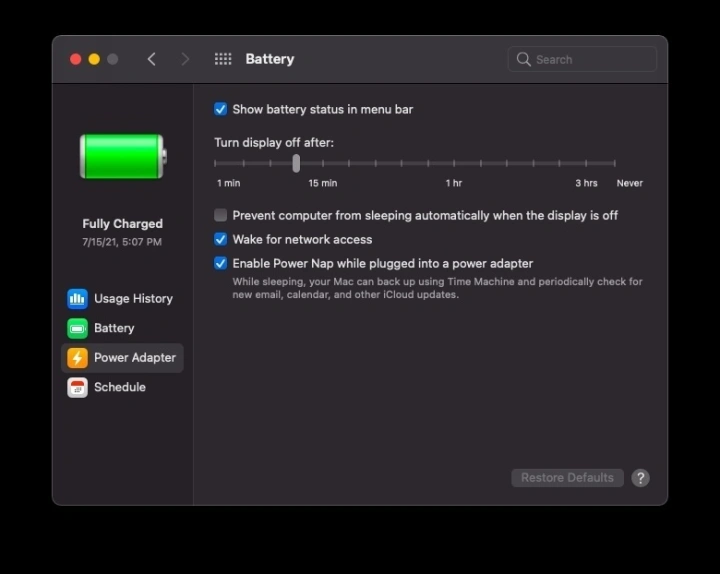Mac用户可以在系统设置>电池和电源适配器选项卡下执行相同的操作。在滑块之后将显示器一直拉到右侧,这样它就永远不会显示。您还应选中当显示器关闭时防止计算机自动休眠旁边的框。现在,您可以关闭笔记本电脑并继续使用它。