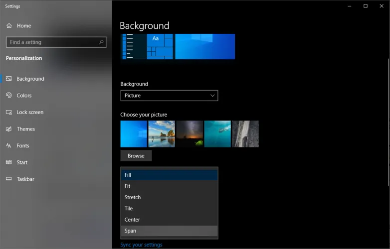 一旦你有了喜欢的墙纸(或墙纸集合),右击桌面并选择个性化(然后在Windows 11中点击背景)。浏览到有问题的图像或文件夹,然后选择Span以填充所有显示器的空间。