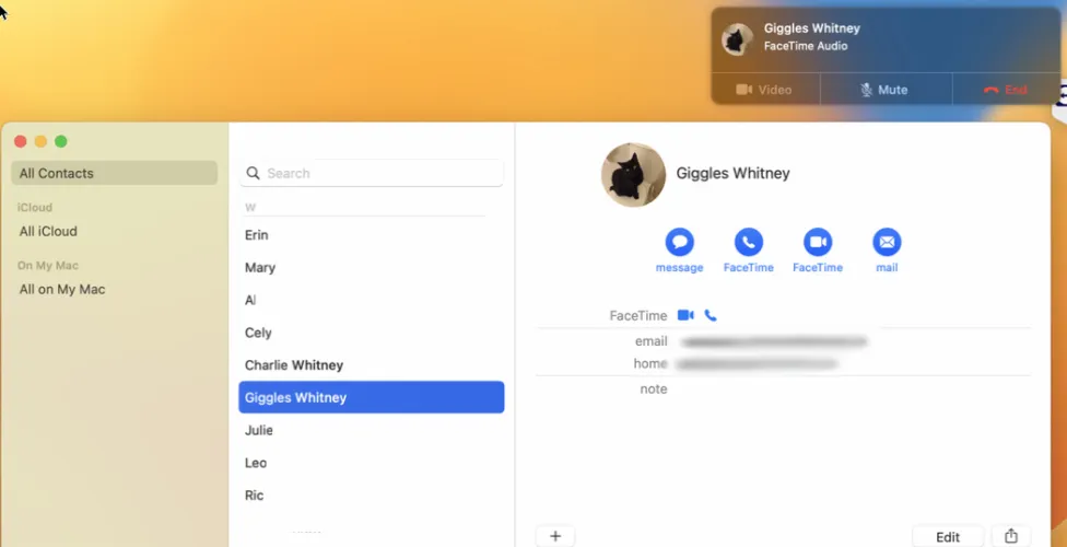 打开联系人应用程序,即可在Mac上呼叫联系人。选择联系人,然后将鼠标悬停在要呼叫的号码上。单击显示的电话图标发出呼叫。