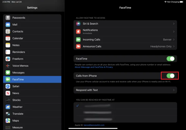 如果您想从iPad接听电话,请在平板电脑上进入设置>FaceTime。打开来自iPhone的来电旁边的开关,开始在此设备上接听电话。