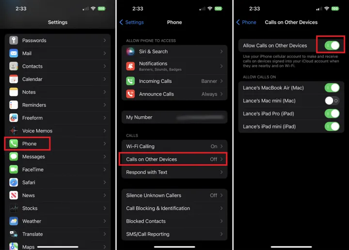 如果您有多个其他支持的Apple设备,如iPad和Mac,您可以选择要在其上允许通话的设备。