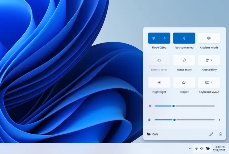 在Windows 11中,Wi-Fi、音量和电池设置通过任务栏上的一个按钮即可找到。点击它,选择音量栏,向右拖动将声音调大;当你松开时,你应该会听到一声“叮当”。