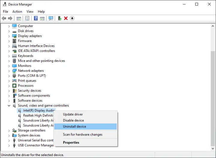 您也可以尝试卸载驱动程序。右击你要使用的设备–在我的例子中,我的笔记本电脑使用的是Realtek音频–然后选择卸载设备。重新启动Windows,它将尝试重新安装其通用驱动程序,这可能会使扬声器恢复活力。
