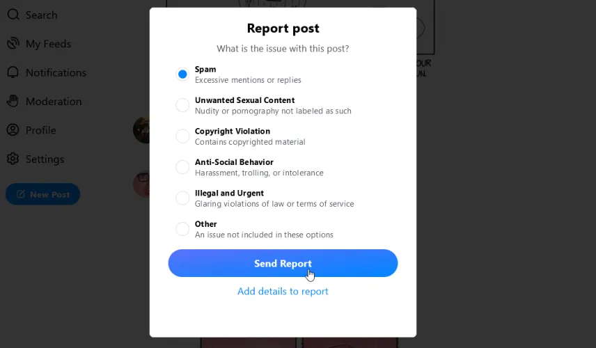 如果你遇到任何冒犯性或令人反感的内容,你可以将帖子静音或举报。对于单个帖子,选择省略号,然后选择静音线程以使其静音,或选择报告帖子以将其报告给Bluesky。如果你举报它,你会被要求选择一个类别,例如,垃圾邮件、不想要的色情内容、侵犯版权等。然后你可以在报告中添加详细信息或立即发送它。