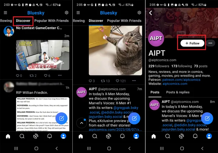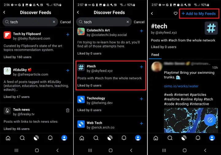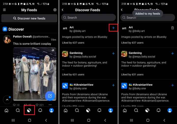 Bluesky允许您查看多个提要。在移动应用程序中,点击底部工具栏中间的My Feed图标。在网站上,点击左侧的My Feed类别。选择顶部显示为发现新提要的字段。向下滚动屏幕并选择您感兴趣的任何提要旁边的加号(+)。否则,请选择提要的名称以查看该提要中的特定帖子和帐户。要执行此操作,请选择添加到我的提要。