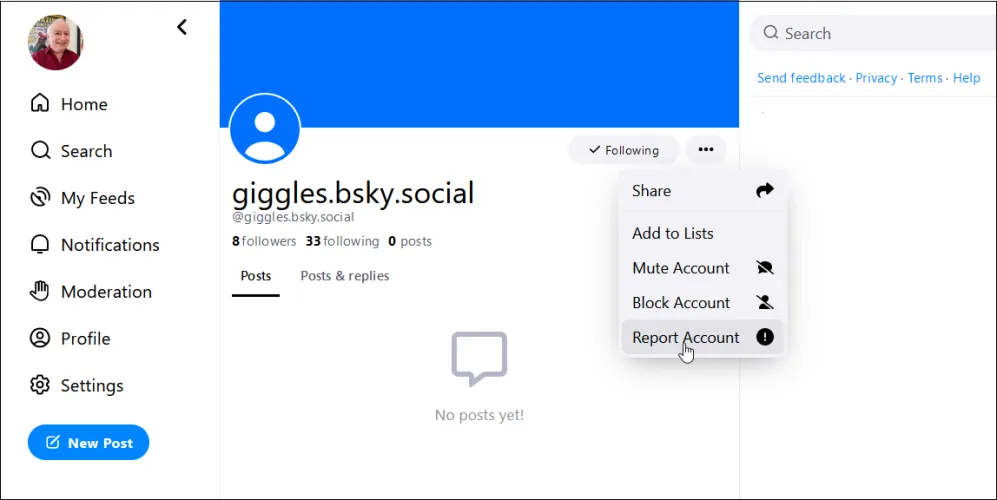 您还可以静音、阻止或报告整个帐户。选择要查看其配置文件页面的帐户名称,然后选择省略号。从这里,将账户静音以使其帖子静音,完全阻止该账户,或向Bluesky报告该账户。