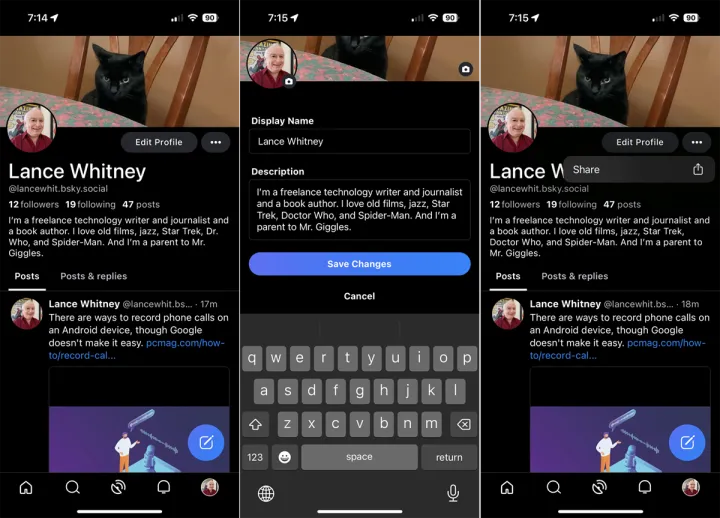 选择编辑个人资料以添加或更改您的显示名称、说明和图片。完成后,保存您的更改。点击省略号图标可与其他应用程序或个人共享您的个人资料。