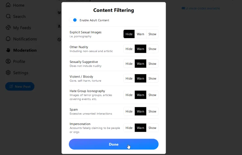 如果你想告诉Bluesky你想要过滤或屏蔽哪种类型的内容,请选择审核类别(在移动应用程序上首先向右滑动)。选择内容筛选以控制您希望在提要中看到的内容类型。选择静音列表以添加要静音的用户的任何公用列表。选择禁用帐户以查看您已禁用和阻止的特定帐户,以查看您已阻止的任何帐户。