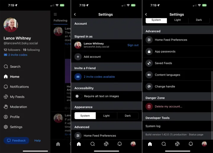 如果选择设置,则可以访问各种选项。在这里,你可以添加另一个Bluesky账号或邀请朋友。但这两个操作都需要额外的邀请代码。你还可以修改屏幕外观、调整订阅源的首选项、设置应用程序密码、查看保存的订阅源、切换语言、更改你的手柄和删除你的帐户。