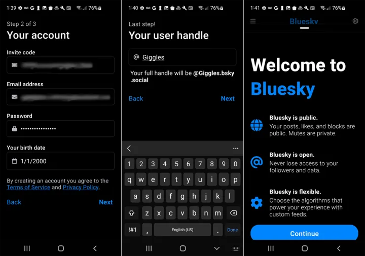 点击下一步,然后输入邀请码(如果有)。输入您的电子邮件地址,创建密码,并选择您的出生日期。点击Next(下一步)并输入您希望用于您的帐户的句柄。您的完整帐号将是[用户名]@bsky.Social。然后欢迎您来到Bluesky。点击继续。