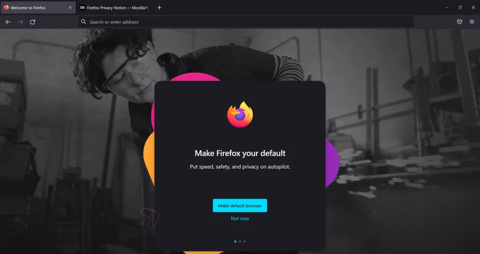 当你第一次在Windows 11上运行Firefox时,网页浏览器会询问你是否希望它成为你的默认浏览器。如果你在第一次运行时没有做出这个选择,Firefox会继续在浏览器窗口的顶部显示一个横幅,提示如下。在测试中,选择启动时的选项或横幅中的选项都可以轻松完成任务。