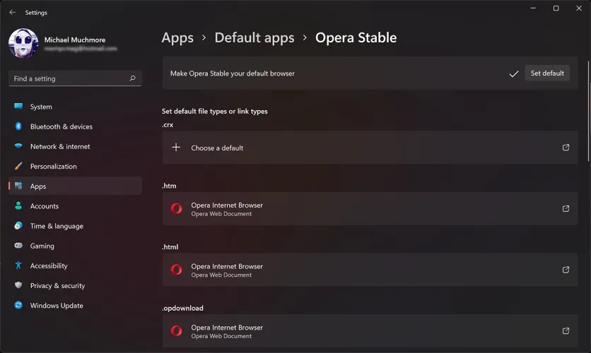 在该界面中,只需点击右侧的Set Default按钮即可。在这里,我们已经将默认的Web浏览器更改为长期替代的程序OPERA。Brave、谷歌Chrome、Vivaldi等也是如此。但是,对于其他非浏览器类型的程序,您仍然需要为应用程序可以打开的每个文件类型分配一个默认类型。
