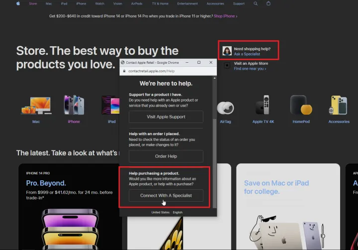 要试用它,请浏览苹果的在线商店,并导航到产品页面。(你可能想要提前做一些研究,提出正确的问题。)当您准备好与某人交谈时,请单击页面顶部的询问专家链接。一个新的浏览器窗口显示三个选项:访问Apple Support以获得当前Apple产品的技术支持;Order Help以检查现有订单;以及与专家联系以获得购物帮助。