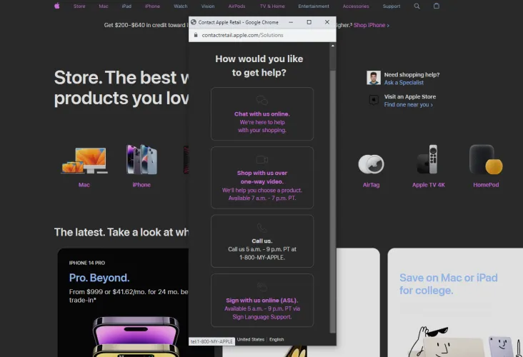 你正试图购买一部新的iPhone,你需要苹果销售人员的帮助。如果你在苹果实体店,这很容易,但如果你想在网上购买商品呢?苹果现在提供了一些与专家交谈的方法,即使你不在商店里也是如此。
