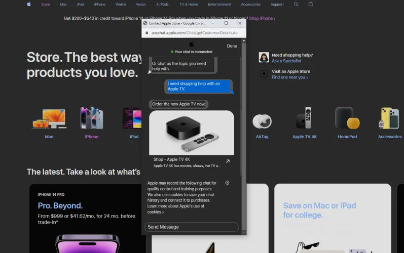 如果您想开始与Apple进行文本聊天,请单击与我们在线聊天。文字聊天从一个自动聊天机器人开始,试图帮助你购买产品。您可以输入您的初始问题,等待回答,然后从那里继续对话。