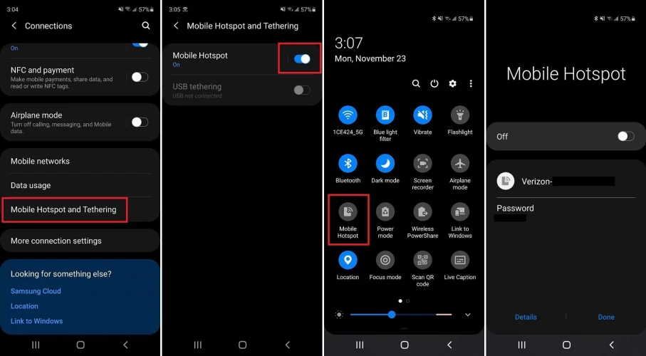 你可以通过搜索“热点”或“系绳”在你的特定设备上更快地找到它。启用热点后,设置屏幕中应显示网络名称和密码。在另一台设备的Wi-Fi设置中输入这些凭据,然后像加入任何其他网络一样加入热点。