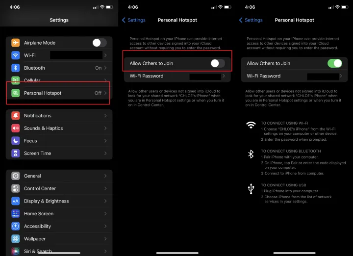 要在iPhone或iPad(Wi-Fi+蜂窝)上设置个人热点,请转到设置>个人热点>允许其他人加入并将其打开(如果您在设置中看不到个人热点,请点击手机>个人热点)。记下Wi-Fi密码。