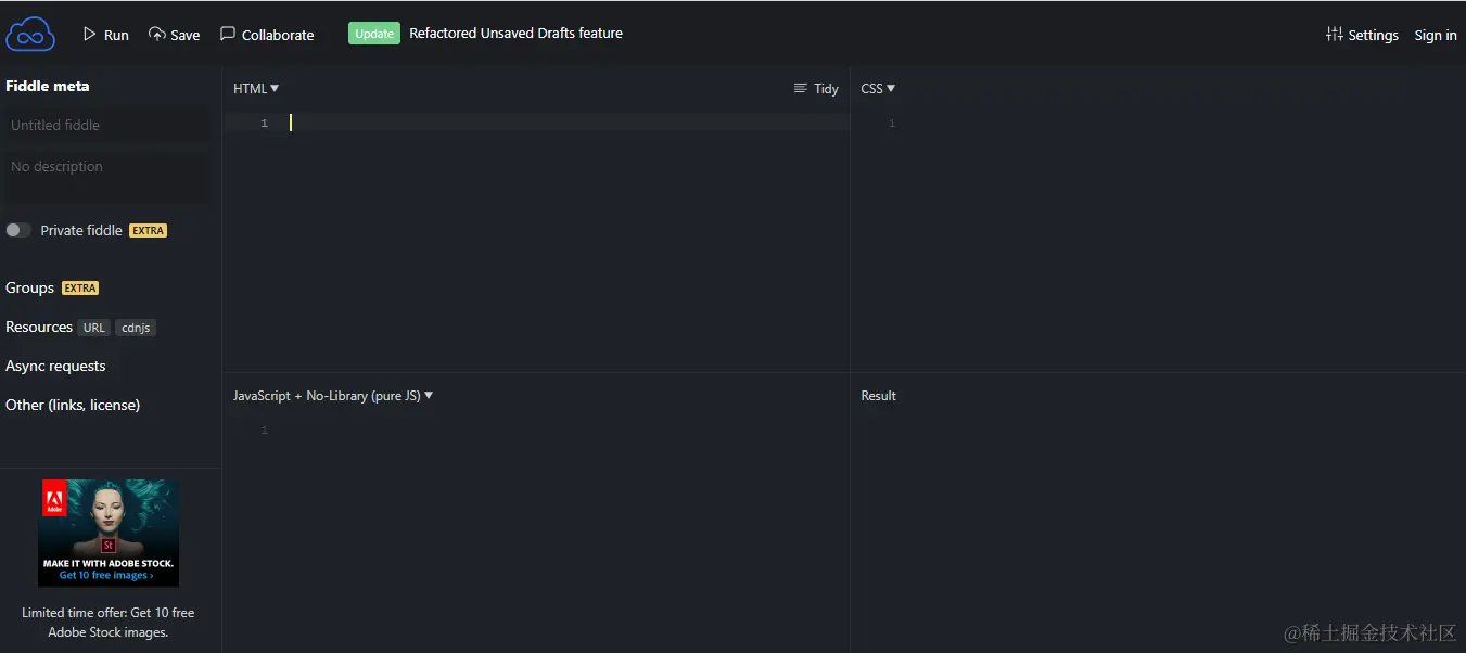 JSFiddle 过去是并将继续是其联盟中最早的代码共享网站之一。使用这个网站非常简单明了。将获得四个单独的面板或子窗口供使用。每个面板分别专门用于编写 HTML、CSS 和 JavaScript 代码。无论将在这些面板中编写什么代码,都可以预览的代码并检查为结果保留的第四个面板中的输出。JSFiddle 有一些漂亮而简洁的功能。可以包含各种 JS 库,它还允许在本地自动保存代码。