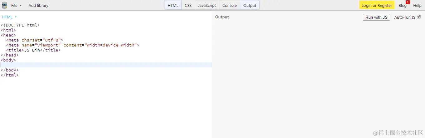JS Bin 是另一个终极代码共享网站,允许使用 HTML、CSS 和 JavaScript 编写代码。JS Bin 还支持其他语言(如 Markdown、Jade 和 Sass)。界面非常简单明了。整个窗口分为多个选项卡。需要根据需要使用选项卡在代码语言之间切换或调出控制台。选择选项卡后,将在左侧和中间部分看到一个面板来编写代码。保留最右边的部分以显示输出。还可以添加 jquery、angular、react 等库。