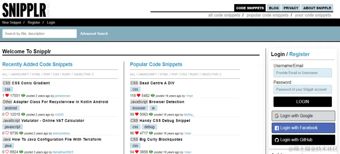 最后但并非最不重要的一点是,让我们谈谈最著名的代码共享网站之一,Snipplr 帮助开发人员与所有人共享他们的代码。它还可以作为多种代码片段和编程语言的存档,例如 Ruby、CSS、JavaScript、Objective C、HTML、PHP 等,之后可以使用。可以在 Snipplr 上免费开设一个新帐户,并将所有代码保存在一个地方。