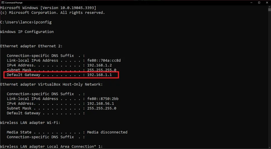 要查找路由器的IP地址,请在Windows搜索栏中键入cmd*以打开命令提示符。在提示符下键入ipconfig,然后按键盘上的Enter键。滚动浏览信息,直到您在以太网卡或无线局域网适配器下看到默认网关的设置。这是您的路由器,它旁边的数字是您的路由器的IP地址。