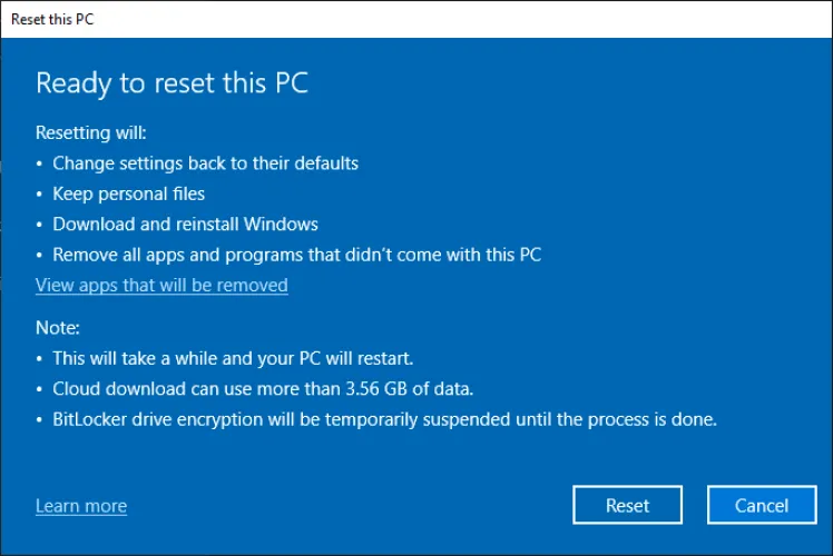 一旦你做出了所有的决定,点击下一步,Windows将生成一个屏幕,总结当你完成重置时会发生什么。如果你选择了保留我的文件,你可以查看重置后将被删除的应用程序列表。当您准备好提交时,请单击重置。您的计算机将重新启动,并在一段时间后重新启动。