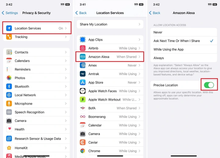 你可以在设置>隐私与安全>定位服务下调整单个应用的定位权限,而不是完全关闭这一功能。从列表中选择一个应用程序,并设置与您的舒适度相匹配的权限。从iOS 14开始,应用程序的定位服务有四种选择: